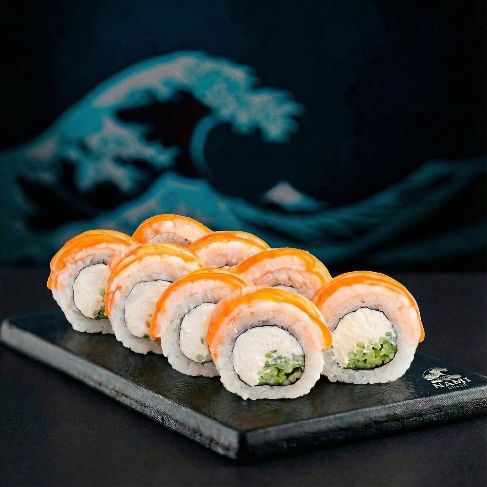 Креветка тигровая, сыр творожный, огурец, рис для суши, нори.