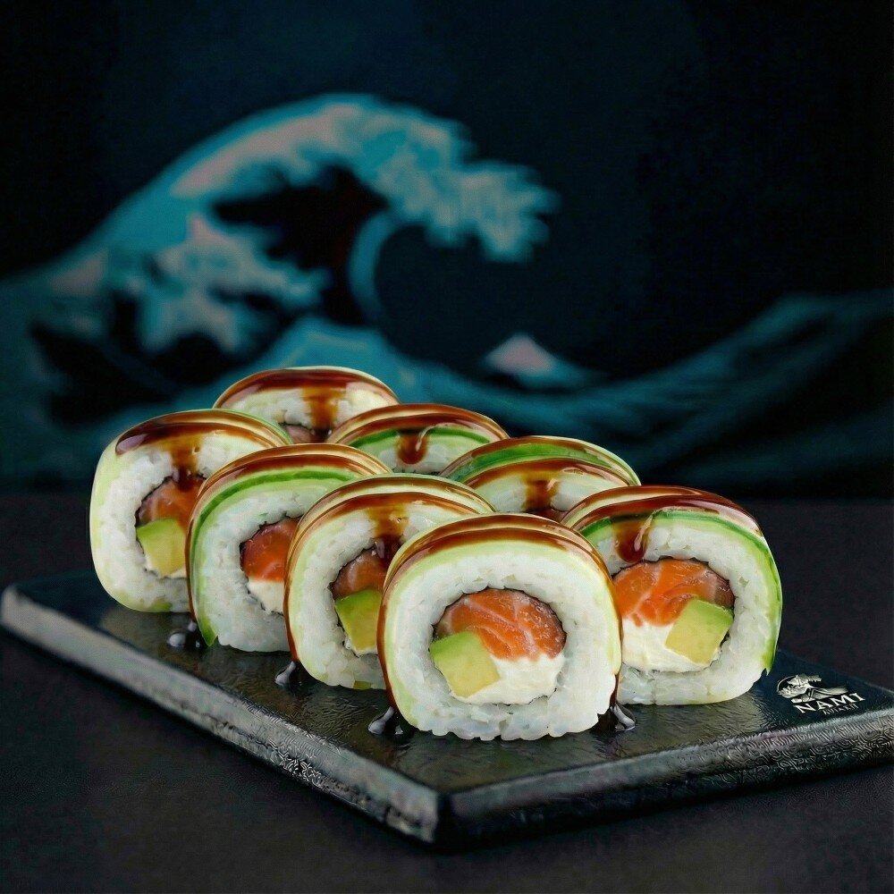 Лосось копченный, сыр творожный, авокадо, огурец, унаги соус, рис для суши, нори.